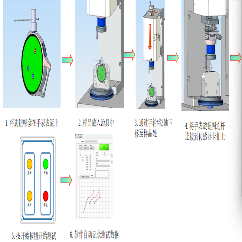 手表旋钮扭力测试设备,采用联往设备专门开发的一套控制软件进行控制,定制高精度扭力传感器进行取样,内部自行开发高速取样硬件,测试时使用砝码进行模拟配重,综合保证产品不同角度,不同力度的测试数据的采集及分析。我司同步开发出三工位扭力测试仪器,有效提升检测效率,节约测试投入问题